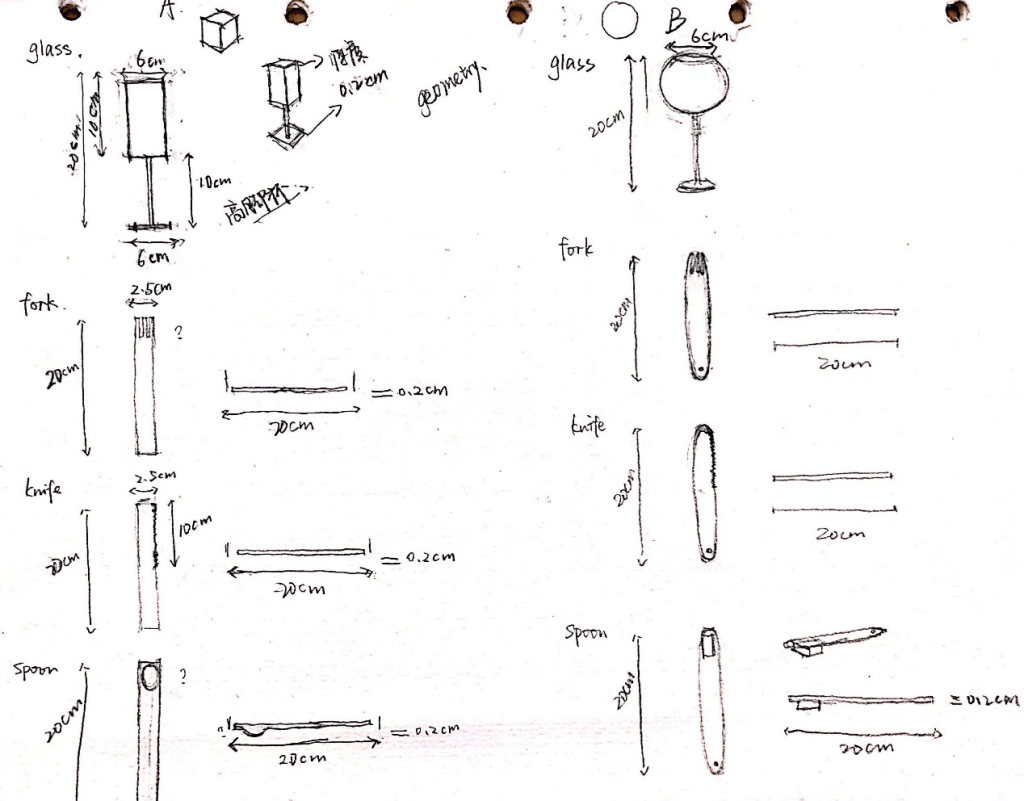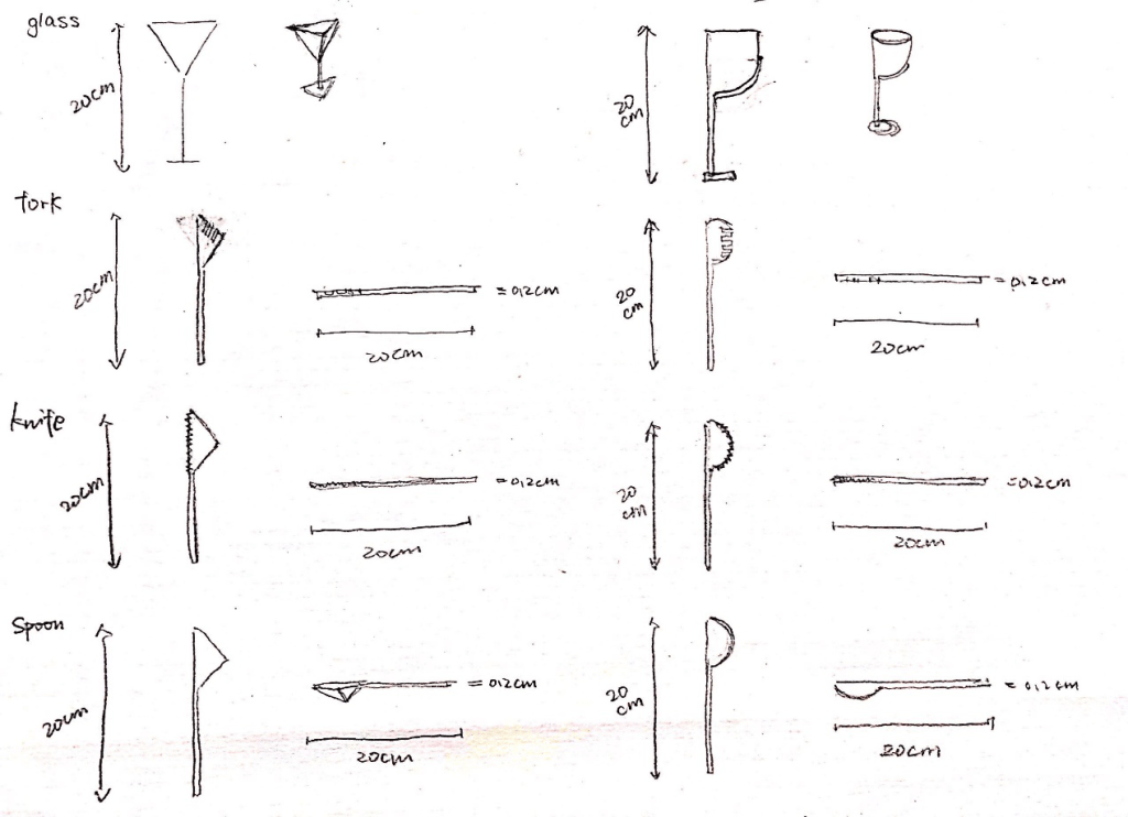 After research some table manners and original untensils size and shapes, I started to draw some stange utensils combined the concept of Bauhuas.